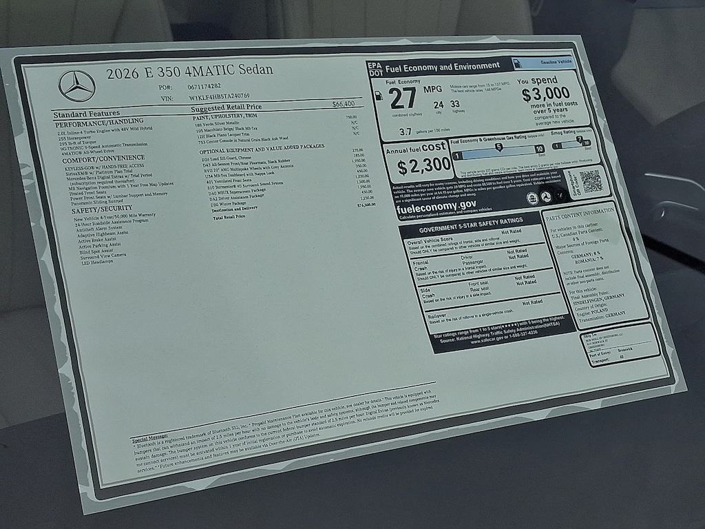 2026 Mercedes-Benz E-Class 4D Sedan E 350 Mercedes-Benz of Greensboro is proud to present you with another True Market Priced Vehicle. This 2026 Mercedes-Benz E-Class E 350 Sedan is loaded with the following Factory Options:4-Wheel Disc Brakes, 6 Speakers, ABS brakes, Air Conditioning, Alloy wheels, AM/FM radio: SiriusXM, Anti-whiplash front head restraints, Apple CarPlay®/Android Auto®, Auto High-beam Headlights, Auto tilt-away steering wheel, Auto-dimming door mirrors, Auto-dimming Rear-View mirror, Automatic temperature control, Brake assist, Bumpers: body-color, Delay-off headlights, Driver door bin, Driver vanity mirror, Dual front impact airbags, Dual front side impact airbags, Electronic Stability Control, Emergency communication system: eCall Emergency System, Exterior Parking Camera Rear, Four wheel independent suspension, Front anti-roll bar, Front Bucket Seats, Front Center Armrest w/Storage, Front dual zone A/C, Front reading lights, Fully automatic headlights, Garage door transmitter: HomeLink, Genuine wood dashboard insert, Head restraints memory, Heated door mirrors, Heated Front Bucket Seats, Heated front seats, Illuminated entry, Knee airbag, Leather steering wheel, Low tire pressure warning, MB-Tex Upholstery, Memory seat, Navigation system: MBUX, Occupant sensing airbag, Outside temperature display, Overhead airbag, Overhead console, Panic alarm, Passenger door bin, Passenger vanity mirror, Power adjustable front head restraints, Power adjustable rear head restraints, Power door mirrors, Power driver seat, Power moonroof, Power passenger seat, Power steering, Power windows, Premium audio system: MBUX, Radio data system, Radio: 3rd Generation MBUX Multimedia System with Navigation, Rain sensing wipers, Rear anti-roll bar, Rear fog lights, Rear reading lights, Rear seat center armrest, Rear window defroster, Remote keyless entry, Security system, Speed control, Speed-sensing steering, Split folding rear seat, Steering wheel memory, Steering wheel mounted audio controls, Tachometer, Telescoping steering wheel, Tilt steering wheel, Traction control, Trip computer, Turn signal indicator mirrors, Variably intermittent wipers, and Weather band radio. 188
