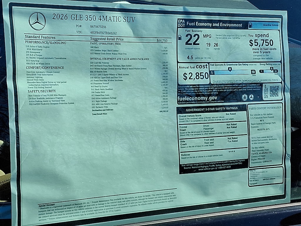 2026 Mercedes-Benz GLE 4D Sport Utility GLE 350 Mercedes-Benz of Greensboro is proud to present you with another True Market Priced Vehicle. This 2026 Mercedes-Benz GLE GLE 350 SUV is loaded with the following Factory Options:4-Wheel Disc Brakes, 8 Speakers, ABS brakes, Air Conditioning, Alloy wheels, AM/FM radio: SiriusXM, Anti-whiplash front head restraints, Apple CarPlay®/Android Auto®, Auto High-beam Headlights, Auto tilt-away steering wheel, Auto-dimming door mirrors, Auto-dimming Rear-View mirror, Automatic temperature control, Brake assist, Bumpers: body-color, Compass, Delay-off headlights, Driver door bin, Driver vanity mirror, Dual front impact airbags, Dual front side impact airbags, Electronic Stability Control, Emergency communication system: eCall Emergency System, Exterior Parking Camera Rear, Four wheel independent suspension, Front anti-roll bar, Front Bucket Seats, Front Center Armrest, Front dual zone A/C, Front reading lights, Fully automatic headlights, Garage door transmitter: HomeLink, Heated door mirrors, Heated Front Seats, Heated front seats, HERMES Communications Module LTE, Illuminated entry, Knee airbag, Leather steering wheel, Low tire pressure warning, MB Navigation, MB-Tex Seat Trim, Memory seat, Navigation system: MBUX, Occupant sensing airbag, Outside temperature display, Overhead airbag, Panic alarm, Passenger door bin, Passenger vanity mirror, Power adjustable front head restraints, Power door mirrors, Power driver seat, Power Front Seats, Power Liftgate, Power moonroof, Power passenger seat, Power steering, Power windows, Premium audio system: MBUX, Radio data system, Rain sensing wipers, Rear anti-roll bar, Rear fog lights, Rear reading lights, Rear seat center armrest, Rear window defroster, Rear window wiper, Remote keyless entry, Security system, SiriusXM Satellite Radio, Speed control, Speed-sensing steering, Speed-Sensitive Wipers, Split folding rear seat, Spoiler, Steering wheel memory, Steering wheel mounted audio controls, Tachometer, Telescoping steering wheel, Tilt steering wheel, Traction control, Trip computer, Turn signal indicator mirrors, Weather band radio, Wheels: 19" Twin 5-Spoke, Wireless Charging, and Wireless Smartphone Integration. 040