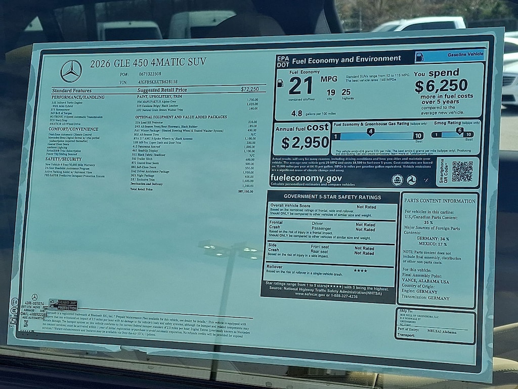 2026 Mercedes-Benz GLE 4D Sport Utility GLE 450 Mercedes-Benz of Greensboro is proud to present you with another True Market Priced Vehicle. This 2026 Mercedes-Benz GLE GLE 450 SUV is loaded with the following Factory Options:20" AMG® Twin 5-Spoke Wheels, 4-Wheel Disc Brakes, 8 Speakers, ABS brakes, Air Conditioning, Alloy wheels, AM/FM radio: SiriusXM, Anti-whiplash front head restraints, Apple CarPlay®/Android Auto®, Auto High-beam Headlights, Auto tilt-away steering wheel, Auto-dimming door mirrors, Auto-dimming Rear-View mirror, Automatic temperature control, Brake assist, Bumpers: body-color, Compass, Delay-off headlights, Driver door bin, Driver vanity mirror, Dual front impact airbags, Dual front side impact airbags, Electronic Stability Control, Emergency communication system: eCall Emergency System, Exterior Parking Camera Rear, Four wheel independent suspension, Front anti-roll bar, Front Bucket Seats, Front Center Armrest, Front dual zone A/C, Front reading lights, Fully automatic headlights, Garage door transmitter: HomeLink, Heated door mirrors, Heated Front Seats, Heated front seats, HERMES Communications Module LTE, Illuminated entry, Knee airbag, Leather steering wheel, Low tire pressure warning, MB Navigation, MB-Tex Seat Trim, Memory seat, Navigation system: MBUX, Occupant sensing airbag, Outside temperature display, Overhead airbag, Panic alarm, Passenger door bin, Passenger vanity mirror, Power adjustable front head restraints, Power door mirrors, Power driver seat, Power Front Seats, Power Liftgate, Power moonroof: Panorama, Power passenger seat, Power steering, Power windows, Premium audio system: MBUX, Radio data system, Radio: 12.3" Media Display with Touchscreen, Rain sensing wipers, Rear anti-roll bar, Rear fog lights, Rear reading lights, Rear seat center armrest, Rear window defroster, Rear window wiper, Remote keyless entry, Security system, SiriusXM Satellite Radio, Speed control, Speed-sensing steering, Speed-Sensitive Wipers, Split folding rear seat, Spoiler, Steering wheel memory, Steering wheel mounted audio controls, Tachometer, Telescoping steering wheel, Tilt steering wheel, Traction control, Trip computer, Turn signal indicator mirrors, Weather band radio, Wireless Charging, and Wireless Smartphone Integration. 956