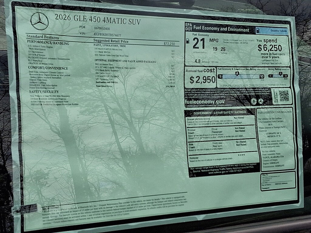 2026 Mercedes-Benz GLE 4D Sport Utility GLE 450 Mercedes-Benz of Greensboro is proud to present you with another True Market Priced Vehicle. This 2026 Mercedes-Benz GLE GLE 450 SUV is loaded with the following Factory Options:20" AMG® Twin 5-Spoke Wheels, 4-Wheel Disc Brakes, 8 Speakers, ABS brakes, Air Conditioning, Alloy wheels, AM/FM radio: SiriusXM, Anti-whiplash front head restraints, Apple CarPlay®/Android Auto®, Auto High-beam Headlights, Auto tilt-away steering wheel, Auto-dimming door mirrors, Auto-dimming Rear-View mirror, Automatic temperature control, Brake assist, Bumpers: body-color, Compass, Delay-off headlights, Driver door bin, Driver vanity mirror, Dual front impact airbags, Dual front side impact airbags, Electronic Stability Control, Emergency communication system: eCall Emergency System, Exterior Parking Camera Rear, Four wheel independent suspension, Front anti-roll bar, Front Bucket Seats, Front Center Armrest, Front dual zone A/C, Front reading lights, Fully automatic headlights, Garage door transmitter: HomeLink, Heated door mirrors, Heated Front Seats, Heated front seats, HERMES Communications Module LTE, Illuminated entry, Knee airbag, Leather steering wheel, Low tire pressure warning, MB Navigation, MB-Tex Seat Trim, Memory seat, Navigation system: MBUX, Occupant sensing airbag, Outside temperature display, Overhead airbag, Panic alarm, Passenger door bin, Passenger vanity mirror, Power adjustable front head restraints, Power door mirrors, Power driver seat, Power Front Seats, Power Liftgate, Power moonroof, Power passenger seat, Power steering, Power windows, Premium audio system: MBUX, Radio data system, Radio: 12.3" Media Display with Touchscreen, Rain sensing wipers, Rear anti-roll bar, Rear fog lights, Rear reading lights, Rear seat center armrest, Rear window defroster, Rear window wiper, Remote keyless entry, Security system, SiriusXM Satellite Radio, Speed control, Speed-sensing steering, Speed-Sensitive Wipers, Split folding rear seat, Spoiler, Steering wheel memory, Steering wheel mounted audio controls, Tachometer, Telescoping steering wheel, Tilt steering wheel, Traction control, Trip computer, Turn signal indicator mirrors, Weather band radio, Wireless Charging, and Wireless Smartphone Integration. 190